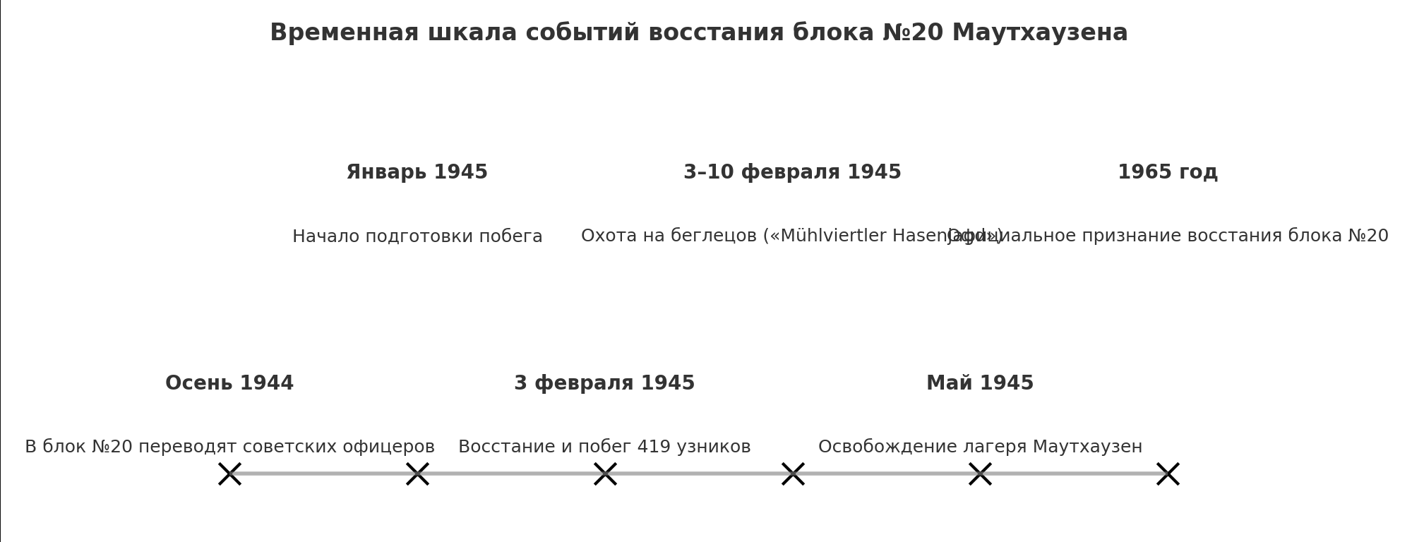 2–3 февраля 1945 | Ночь восстания. Побег 419 узников. Захват пулемётной вышки, убийство 20 охранников. |